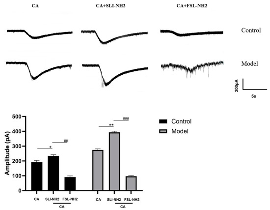 Effects of a PAR2 agonist, a TRPA1 agonist and a PAR2 antagonist on the activity of guinea pig nodose ganglion neurons. Activation of TRPA1 induced an inward current, activation of PAR2 further amplified the inward current elicited by the TRPA1 agonist, and inhibition of PAR2 reduced the inward current elicited by the TRPA1 agonist. PAR2 agonist (SLI-NH2 100 µM), TRPA1 agonist (CA 500 µM), PAR2 antagonist (FSL-NH2 10 µM). The results are presented as the means ± standard deviations (vs. the TRPA1 agonist group: * p < 0.05, ** p < 0.0; vs. the PAR2 agonist + TRPA1 agonist group: ## p < 0.01, ### p < 0.001).