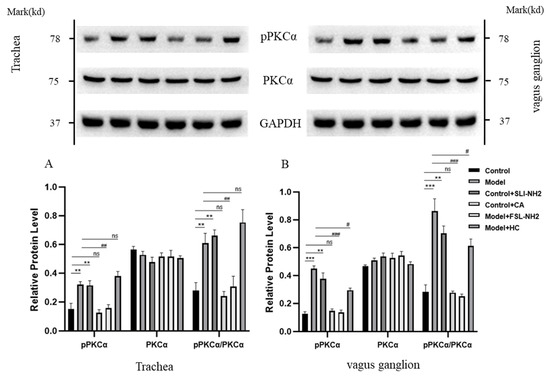 The effects of a PAR2,TRPA1 agonist/antagonist on the phosphorylation of PKCα (pPKCα) and PKCα in the nerve fibers of the trachea and the vagus ganglion in guinea pigs were evaluated. (A) In the nerve fibers of the trachea in the citric acid-induced enhanced cough guinea pigs, pPKCα was increased. Activation or inhibition of PAR2 upregulated or downregulated pPKCα, respectively, whereas activation or inhibition of TRPA1 did not affect pPKCα. (B) The change in pPKCα expression in the vagus ganglion was consistent with that in (A). PAR2 agonist (SLI-NH2, 200 µg/kg), TRPA1 agonist (CA, 5 mg/kg), PAR2 antagonist (FSL-NH2, 200 µg/kg), TRPA1 antagonist (HC, 200 µg/kg). The results are presented as the means ± standard deviations (vs. the control group: ** p < 0.01, *** p < 0.001; vs. the cough model group: # p < 0.05, ## p < 0.01, ### p < 0.001; ns: p > 0.05).
