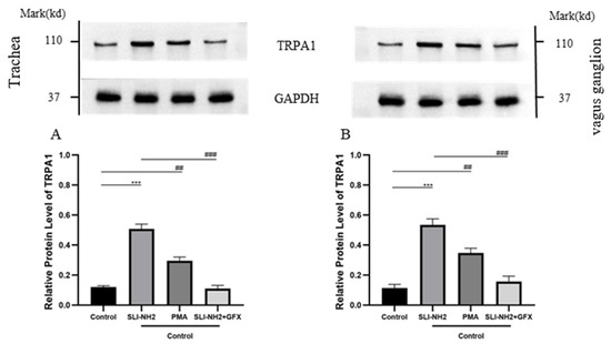 Total protein was extracted from jugular and nodose ganglion and trachea tissues. Proteins(30 μg) were separated using 10% sodium dodecyl sulfate–polyacrylamide gel electrophoresis and subsequently transferred to polyvinylidene difluoride (PVDF) membranes (Millipore, Burlington, MA, USA). After blocking with PBS containing 5% skim milk for 2 h at room temperature, the membranes were washed with PBS-T (PBS with 0.05% Tween-20). They were then incubated overnight at 4 °C with rabbit primary antibodies against TRPA1 (1:1000, Novus, LLC, Salt Lake City, UT, USA), PKCα (1:1000, Abcam, Cambridge, UK), phosphorylated PKCα (pPKCα) (1:1000, Cell Signaling Technology, Danvers, MA, USA), or PAR2 (1:1000, Abcam, Cambridge, UK). Following PBS-T washes, the membranes were incubated with horseradish peroxidase (HRP)-conjugated goat anti-rabbit IgG secondary antibody (1:2000, Abcam, Cambridge, UK) for 2 h at room temperature. After additional PBS-T washing, chemiluminescence substrate (Thermo Fisher Scientific, Waltham, MA, USA) was applied to the membranes. Signal detection was performed using an enhanced chemiluminescence system (Image Quant LAS-4000 MINI; GE Healthcare Bioscience, Pittsburgh, PA, USA). Samples from five animals per group were analyzed using Image-Pro Plus software 7.0. Western blot original images can be found in Figure S1.