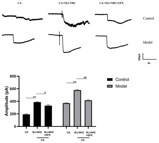The effects of a PAR2 agonist, TRPA1 agonist, and PKC antagonist on the electrical activity of neurons in the nodose ganglion of guinea pigs were evaluated. Activation of TRPA1 resulted in an inward current, the amplitude of which was further increased by the PAR2 agonist in the presence of the TRPA1 agonist. Additionally, the amplitude of the inward current in the citric acid-induced enhanced cough group was significantly greater than that in the control group. A PKC antagonist effectively blocked this effect. PAR2 agonist (SLI-NH2 100 µM), TRPA1 agonist (CA 500 µM), PKC antagonist (GFX 10 µM). The results are presented as the means ± standard deviations (vs. the CA group: ** p < 0.01; vs. the SLI-NH2 + CA group: # p < 0.05, ## p < 0.01).