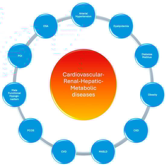 According to the 2024 guidelines of the EASL-EASD-EASO, cardiometabolic criteria are now part of the definition and diagnosis of MASLD, which was previously termed non-alcoholic fatty liver disease (NAFLD) before 2023 []. Specifically, the most common cardiometabolic disorders associated with MASLD include overweight/obesity (∼90%), prediabetes/T2DM (∼60%), prehypertension/arterial hypertension (∼85%), hypertriglyceridemia (∼75%), low high-density lipoprotein cholesterol (HDL-C, ∼60%), and HF with preserved ejection fraction (HFpEF, ∼50%) [,]. Furthermore, individuals with MASLD are at an increased risk of cardiovascular mortality (hazard ratio [HR] 1.30), non-fatal CVD (HR 1.40), coronary artery disease (odds ratio [OR] 1.33), HF (OR 1.5), CKD (HR 1.43), T2DM, and diabetes-related peripheral polyneuropathy (HRs 2.19 and 2.48, respectively), and obstructive sleep apnea (OSA, HR 2.22) []. This group of associated conditions and additional disorders related to increased cardiometabolic risk create the spectrum of Cardiovascular-Renal-Hepatic-Metabolic diseases (Figure 1).