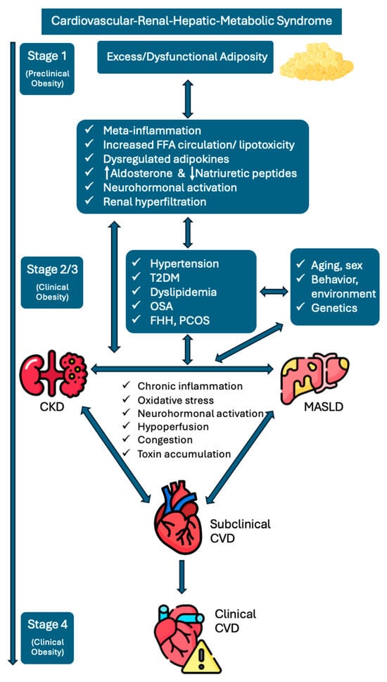 Schematic illustration of the pathophysiological interplay and progression of the CRHM syndrome. Adiposity marks the first stage of the CRHM syndrome, where excess or dysfunctional fat tissue triggers mechanisms like meta-inflammation and adipokine imbalance, driving CRHM risk factors such as hypertension, T2DM, and dyslipidemia. It also directly contributes to MASLD, CKD, and CVD. These conditions are interconnected through shared mechanisms, including neurohormonal activation, inflammation, oxidative stress, and congestion, leading to progressive multi-organ dysfunction. The final stage is established CVD, such as HF or ASCVD. Factors like age, sex, genetics, lifestyle, and environmental exposures further influence the development and progression of CRHM. Abbreviations. ASCVD (atherosclerotic cardiovascular disease); CKD (chronic kidney disease); CVD (cardiovascular disease); CRHM (cardiovascular-renal-hepatic-metabolic); FFA (free fatty acids); FHH (functional hypogonadotrophic hypogonadism); HF (heart failure); MASLD (metabolic dysfunction-associated steatotic liver disease); OSA (obstructive sleep apnea); PCOS (polycystic ovarian syndrome); T2DM (type 2 diabetes mellitus).