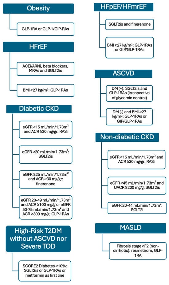 We are witnessing a global pandemic of cardiometabolic disorders, which has slowed or even reversed earlier declines in cardiovascular disease (CVD) mortality, prompting stronger efforts to improve prevention and treatment strategies []. Over the past five years, our understanding of these conditions has evolved dramatically. Obesity, type 2 diabetes mellitus (T2DM), atherosclerotic CVD (ASCVD), heart failure (HF), chronic kidney disease (CKD), and metabolic dysfunction-associated steatotic liver disease (MASLD) were once treated as separate conditions. Today, they are recognized as interconnected disorders sharing common pathophysiological pathways that drive parallel disease progression []. Simultaneously, new medications such as sodium-glucose cotransporter 2 inhibitors (SGLT2i), glucagon-like peptide-1 receptor agonists (GLP-1RAs), combined gastric inhibitory polypeptide (GIP)/GLP-1 receptor agonists, and finerenone have demonstrated benefits across multiple conditions in this spectrum, improving both quality of life and hard clinical outcomes [,].