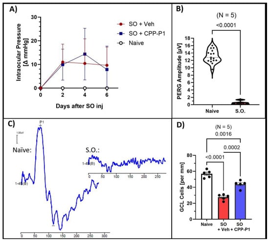Damage produced by silicone oil (SO)-induced ocular hypertension and CPP-P1-mediated RGC protection. (A) Intraocular pressure (IOP) measurements indicated a significant (p < 0.01) elevation in IOP occurred following SO injection. Delta mmHg was calculated compared to respective baseline values. (B) Pattern electroretinogram (PERG) amplitude measurements of healthy eyes (naïve) compared to those injected with SO. (C) Representative PERG graphs were obtained from the eyes with and without SO. (D) GCL counts from retinal cross-sections showed significant preservation of GCL cells with CPP-P1 treatment.