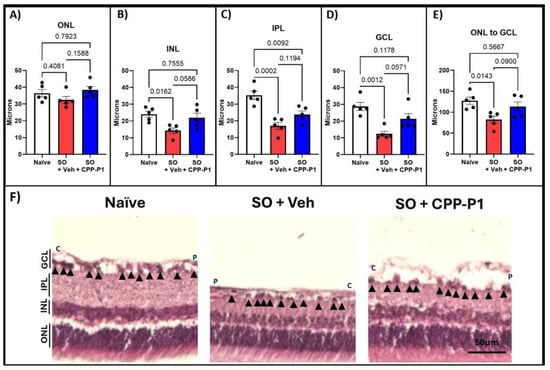 Retinal-layer thickness measurements following H&E staining. Thickness measurements were taken from the (A) outer nuclear layer (ONL), (B) inner nuclear layer (INL), (C) inner plexiform layer (IPL), (D) ganglion cell layer (GCL), and (E) total retinal thickness. (F) Representative images illustrate the significant loss in retinal thickness following SO injection and the preservation of retinal layers with CPP-P1 administration. Black arrowheads indicate the cells in the RGC layer that were analyzed and included in Figure 1D. C indicates the more central location and P indicates the more peripheral location. Scale bar 50 µm.