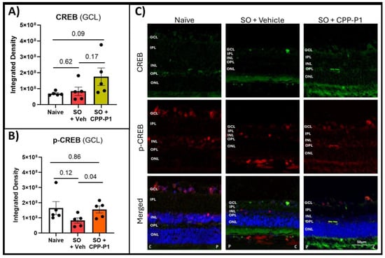 Given the critical role of CREB in mediating neuroprotective and survival pathways within retinal neurons, we assessed its expression levels in the ganglion cell layer (GCL) across different treatment groups. CREB expression in the GCL was quantified by measuring the integrated density using ImageJ. Both the naïve and SO + vehicle groups exhibited similarly low levels of CREB expression (Figure 3A). However, in the SO + CPP-P1 group, CREB expression was higher than in the naïve group, approaching statistical significance (p = 0.09). Additionally, the naïve group displayed approximately twice the phosphorylated CREB (p-CREB) expression relative to CREB (Table 2). In contrast, the SO + vehicle group demonstrated a reduced p-CREB-to-CREB ratio, with p-CREB levels approximately half of those observed in the naïve group (p = 0.12). Notably, the SO + CPP-P1 group maintained p-CREB expression similar to the naïve group (p = 0.86) (Figure 3B). These findings suggest that CPP-P1 treatment may enhance CREB activation, potentially contributing to its neuroprotective effects in the GCL under conditions of SO-induced stress.