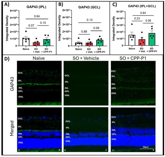 GAP43 is a critical marker of neuronal growth and synaptic plasticity, making its analysis essential for understanding the neuroprotective effects of CPP-P1 treatment in retinal neurons under stress conditions. GAP43 expression was quantified by measuring integrated density in the IPL and GCL. No significant differences were observed in GAP43 expression between the naïve and IOP-elevated, vehicle-treated groups. However, trends of increased GAP43 expression were noted in the IPL and GCL of CPP-P1-treated rats post IOP elevation vs. vehicle-treated controls (p = 0.15, p = 0.09, respectively) (Figure 4).