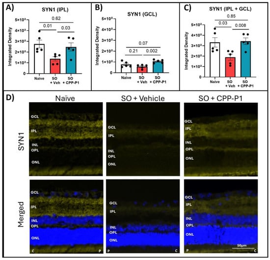 To gain a more comprehensive understanding of the neuroprotective effects of CPP-P1, we extended our analysis to include SYN1, a crucial protein in synaptogenesis and synaptic function, in addition to GAP43. SYN1 expression was measured by integrated density in the IPL and the GCL. There was a notable expression of SYN1 in the naïve IPL and a much lower expression in the GCL compared to GAP43. This expression significantly declined in the vehicle-treated group in the IPL (p = 0.01), and a similar trend of decreased SYN1 expression was observed in the GCL (p = 0.21). Rats treated with CPP-P1 showed significant increases in SYN1 in both the IPL (p = 0.03) and the GCL (p = 0.002) compared to the vehicle-treated group (Figure 5).