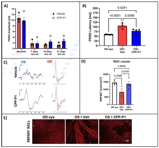 To comprehensively evaluate the neuroprotective effects of CPP-P1 following SO removal, we analyzed RGC survival using RBPMS-positive cell analysis. We monitored PERG responses, integrating both structural and functional assessments to understand the retinal preservation under SO-induced stress. In this round of experiments, SO was removed from the eyes, and PERG was monitored for an additional 3 weeks before tissue collection. Following SO injection and subsequent removal, a significant decrease in PERG amplitude was observed (p < 0.0001). This reduction was consistent across rats treated with either vehicle or CPP-P1, showing minimal difference between the two groups (Figure 6A). However, analysis of PERG latency revealed that retinas treated with CPP-P1 exhibited significant preservation compared to those treated with the vehicle (Figure 6B). Images were taken from each of the four quadrants of the retina, and the OD (right) eyes were used as a contralateral control. The average number of RBPMS-positive cells was 1445 ± 45, 831 ± 209, and 1366 ± 154 per mm2 for the OD eyes, the SO + vehicle OS (left) eyes, and the SO + CPP-P1 OS eyes, respectively (Figure 6C). As a result, the SO-induced IOP elevation showed an approximately 42% loss in RGCs (p = 0.009), while the addition of CPP-P1 reduced this loss by about 37% (p = 0.03).