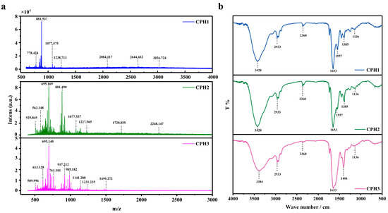 Characteristic spectrum of type I collagen peptide. (a) MALDI-TOF MS and (b) FTIR of CPH1, CPH2, and CPH3.