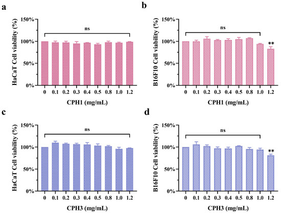Cytotoxicity of CPH1 and CPH3. (a) The effects of CPH1 on the viability of HaCaT and (b) B16F10 cells. (c) The effects of CPH3 on the viability of HaCaT and (d) B16F10 cells, ** p < 0.01, versus negative control group, ns: no significant, n = 3.