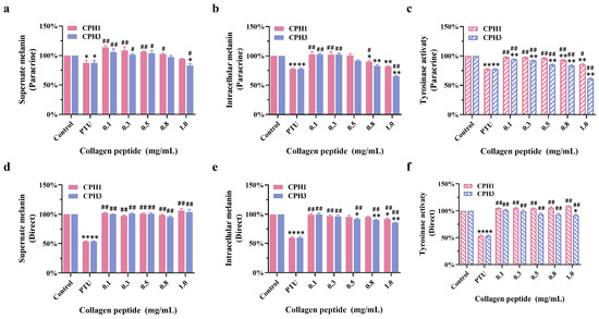 The effects of CPH1 and CPH3 on melanin and TYR. (a) The content of melanin in extracellular supernatant of B16F10 under paracrine action. (b) The content of intracellular melanin in B16F10 under paracrine action. (c) TYR activity in B16F10 under paracrine action. (d) The content of melanin in extracellular supernatant of B16F10 under direct action. (e) The content of intracellular melanin in B16F10 under direct action. (f) TYR activity in B16F10 under direct action. * p < 0.05, ** p < 0.01, versus negative control group. # p < 0.05, ## p < 0.01, versus positive control group (PTU: 1-Phenyl-2-Thiourea, 50 μM), n = 3.