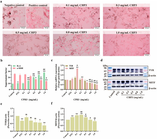 The effect of CPH3 on related protein expression in B16F10 cells under paracrine action. (a) In cultured B16F10, melanin pigmentation was visualized by Fontana–Masson staining. (b) The contents of factors IL-6 and α-MSH in HaCaT cell supernatant were detected by ELISA. (c) Densitometric analysis shows the relative intensity of the nuclear TYR and MITF. (d–f) Western blotting of TYR and MITF protein level in B16F10. * p < 0.05, ** p < 0.01, versus negative control group. # p < 0.05, ## p < 0.01, versus positive control group (PTU: 1-Phenyl-2-Thiourea, 50 μM), ns: no significant, n = 3.
