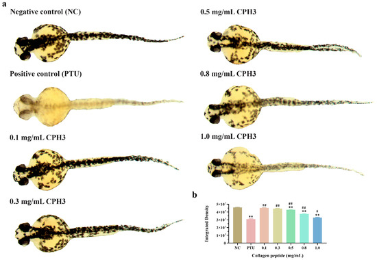 Wild-type (AB) zebrafish embryos were selected 24 h after fertilization. Subsequently, collagen-peptide drugs were administered for 48 h, and the mortality rate and developmental status of zebrafish larvae were assessed. The distribution of melanin in the zebrafish model was observed using a stereo fluorescence microscope (Leica M205FA, Wetzlar, Germany), and the results were analyzed using statistical software Image J (Java 1.8.0).