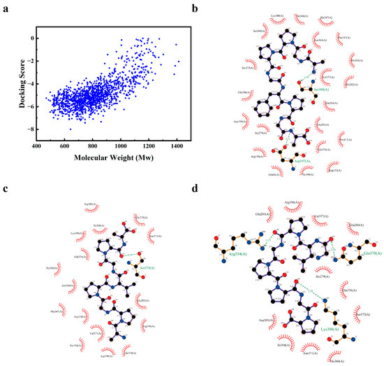 Screening of CPH3 tyrosinase inhibitory peptide. (a) Relationship between collagen polypeptides with binding capacity and molecular weights. (b) 2D diagram of molecular docking between TYR and Nona-AGA, (c) Octa-APA, and (d) Octa-GGP.