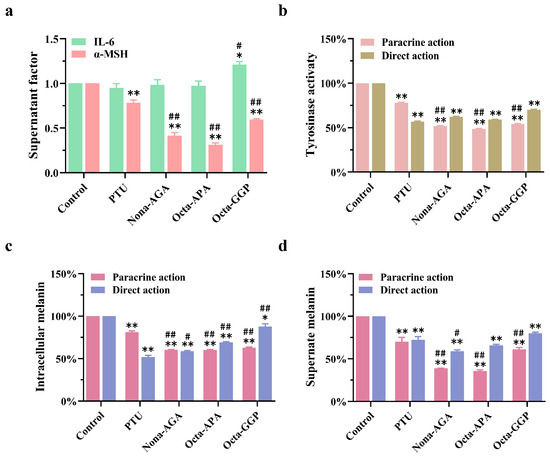 Inhibition of melanogenic activity of peptides in B16F10 cells. (a) Determination of factor content in IL-6 and α-MSH supernatant by Nona-AGA, Octa-APA, and Octa-GGP, effects of (b) TYR activity in B16F10 cells, and melanin content in (c) cells and (d) supernatant, the concentration of collagen polypeptide was 1.0 mg/mL. * p < 0.05, ** p < 0.01, versus negative control group. # p < 0.05, ## p < 0.01, versus the positive control group (PTU: 1-Phenyl-2-Thiourea, 50 μM), n = 3.