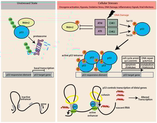 The abundance and stability of p53 are critical for its activity. The regulation of cellular p53 levels mainly occurs through ubiquitin-mediated proteasomal degradation. In an unstressed cell, ubiquitination by the p53-specific E3 ligase, MDM2, targets p53 for proteasomal degradation. Upon stress, the phosphorylation of p53 disrupts the interaction with Mdm2, which leads to the stabilization of p53 (Figure 1) [21,22,23]. Various kinases, including the DNA damage response kinases ATM/ATR/DNA-PK and CHK1/CHK2, mediate this modification following DNA damage, particularly at serine residues Ser15 and Ser20 [24,25]. Rapid phosphorylation of these N-terminal regulatory sites activates p53 in response to stress signals. It should be noted, however, that p53 can be activated without phosphorylation [26].
