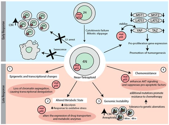 Even if cells survive the early response to WGD and continue to proliferate, their overall fitness may still be compromised due to the downstream cellular events that trigger genomic instability, tumor progression, and cancer development [150]. p53 plays a significant role in monitoring cellular integrity after WGD. WGD causes replication stress, aberrant mitoses, and disrupts chromatin organization, which leads to substantial epigenetic and transcriptional changes that fuel oncogenesis (Figure 4). These disruptions accelerate chromosomal abnormalities such as aneuploidy, which further compounds the oncogenic transformation, particularly in p53 deficient cells [151,152,153]. A notable example of this phenomenon is seen in multiple myeloma, where tumors in approximately 6% of patients exhibit tetraploid karyotypes [154]. This chromosomal abnormality is associated with a poor prognosis and is linked to TP53 alterations [155]. Similarly, esophageal carcinoma is typically associated with whole genome doubling and TP53 mutations [156]. These findings highlight the connection between WGD, TP53 mutations, and aggressive malignant disease progression.