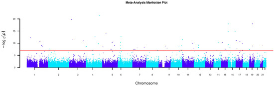 - Willer, C.J.; Li, Y.; Abecasis, G.R. METAL: Fast and efficient meta-analysis of genomewide association scans. Bioinformatics 2010, 26, 2190–2191. [Google Scholar] [CrossRef]