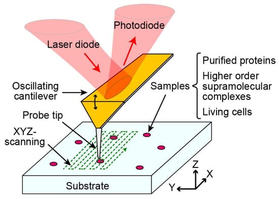 - Ando, T. High-Speed Atomic Force Microscopy and Its Future Prospects. Biophys. Rev. 2018, 10, 285–292. [Google Scholar] [CrossRef]