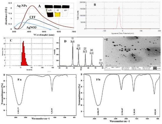 Biosynthesized and characterized Ag-NPs, (A) UV–visible, (B) zeta potential, (C) DLS pattern, (D) X-ray diffraction pattern (XRD), (E) transmission electron microscopic (TEM), (Fa) FTIR spectrum of CFF, and (Fb) FTIR spectrum of Ag-NPs.