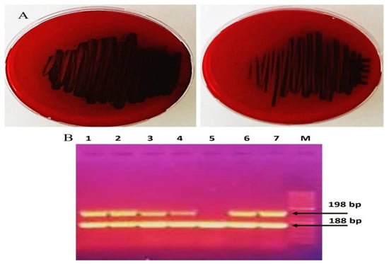 Congo red agar medium consisting of (g/L) brain heart infusion (Difco) 37.0, sucrose 50.0, agar 10.0, and Congo red (Sigma-Aldrich, Taufkirchen Kreis München, Germany) solution 0.8 was used to qualitatively determine biofilm forming by MRSA isolates. The bacterial isolates were then transferred to plates with CRA medium and incubated for 24 h at 37 °C. After the incubation period, the bacteria that formed biofilms generated colonies that were black in color, while other bacteria resulted in red colonies [25].