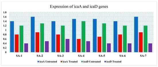 RT-PCR expression of the biofilm-associated genes (icaA and icaD) treated with Ag-NPs, sub-MIC level and untreated (control).