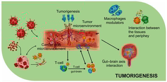 On the neurobiology front, the kynurenine pathway is also implicated in neurotoxicity and neuroinflammation [113]. The metabolites of kynurenine, such as quinolinic acid, are neurotoxic and have been linked to various neurodegenerative diseases, including Alzheimer’s and Parkinson’s diseases [114]. These neurotoxic metabolites can cross the blood–brain barrier and lead to excitotoxicity, which damages neurons and exacerbates neuroinflammatory responses [115]. The interplay between kynurenine metabolites and the brain’s immune system makes this pathway a critical bridge between gut-derived metabolites, neuroinflammation, and cancer progression [116]. Moreover, the kynurenine pathway is a vital link between the gut microbiota and cancer immune escape [117]. Tumors can manipulate this pathway to enhance the production of immunosuppressive metabolites, which help create an environment where cancer cells can evade immune surveillance [118]. This pathway’s influence on neuroinflammation and tumor immunity elevates the potential of targeting the tryptophan–kynurenine axis as a therapeutic approach for diseases involving both the brain and cancer, including brain tumors [119]. Figure 1 illustrates the role of gut metabolites in modulating host physiology, particularly in influencing immune responses and systemic inflammation. Independently, Figure 2 highlights the neurobiological mechanisms that interact with metabolic signals, demonstrating how microbial metabolites can influence neurotransmitter synthesis and neuroinflammation. Meanwhile, Figure 3 presents tumorigenesis as a multifactorial process, where both gut-derived metabolites and neurobiological factors contribute to cancer progression. These mechanisms do not occur sequentially but function as independent yet interconnected events, where gut metabolites (Figure 1) shape systemic immune responses, neurobiological pathways (Figure 2) mediate stress and inflammation, and tumorigenesis (Figure 3) emerge from the cumulative effects of these interactions. This complex network suggests a bidirectional influence among gut metabolism, neurological processes, and cancer development rather than a linear causative pathway.