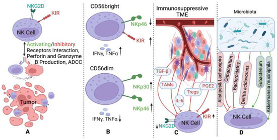 NK Cell Function, Regulation, and Clinical Implications in Prostate Cancer (PCa). The figure uses different arrow types to represent various interactions: a green arrow indicates activation, a red arrow represents inhibition, a black double-headed arrow signifies interaction, an upward black arrow denotes an increase, and a downward black arrow signifies a decrease. (A) NK Cell Function: NK cell activity is regulated by a balance between activating receptors such as NK Group 2 Member D (NKG2D) and inhibitory receptors like Killer-cell Immunoglobulin-like Receptor (KIR). Their function includes direct cytotoxicity through granzyme B and perforin production, as well as antibody-dependent cellular cytotoxicity (ADCC). (B) NK Cell Subsets: Shows the two main subsets: CD56dimCD16+ (cytotoxic) and CD56brighCD16− (cytokine-producing), which can become cytotoxic as well. (C) Tumor Microenvironment (TME) and NK Cell Suppression: Depicts how factors in the TME like tumor growth factor β (TGF-β), interleukin 6 (IL-6), Regulatory T cells (Tregs), prostaglandin E2 (PGE2), and tumor-associated macrophages (TAMs) suppress NK cell function. (D) Microbiome Influence on NK Cells: Shows how different bacteria in the microbiome can either support or suppress NK cell activity in PCa (Biorender, Fanijavadi, S. (2025) https://BioRender.com/a43k204 (accessed on 7 February 2025)).