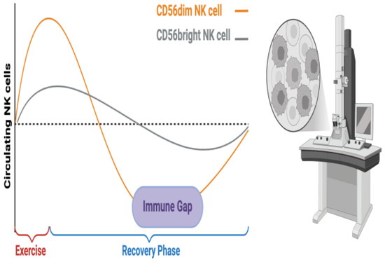 Exercise-Induced NK Cell Mobilization and the Immune Gap. This diagram shows how NK cells increase during exercise but drop sharply post-exercise under the normal baseline level (dotted line), creating an immune gap—a temporary period of reduced immune surveillance. CD56dim NK cells, which are more responsive to exercise, show a greater increase and decline compared to CD56bright NK cells. This drop may reduce tumor infiltration, weaken cytokine signaling, and potentially allow tumor cells to evade detection response (Biorender, Fanijavadi, S. (2025) https://BioRender.com/j96q812 (accessed on 7 February 2025)).