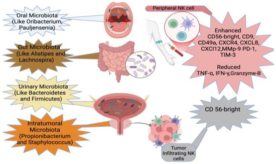 Given that NK cells interact with the microbiome (Figure 1, section D), we hypothesize that a combined signature of NK cell phenotypes and microbiome profiles from stool, urine and oral samples could serve as a surrogate marker for NK cell activity. This approach offers a feasible alternative to directly monitoring NK cell phenotyping through biopsies, enabling indirect assessment of NK cell function in tumors through NK cell activity in blood tests and microbiome signatures. The role of NK cells in the management of PCa remains incompletely understood. Measuring NK cells in blood samples has been proposed as a reliable, minimally invasive tool for screening, assessing treatment effects, and predicting survival outcomes in PCa patients. This review explores current evidence on the potential role of NK cells in PCa management, with a particular focus on the interaction between NK cells and the microbiome.