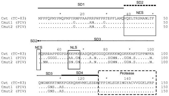 Comparison of the wild-type capsid protein (from VEEV TC-83) and two mutant variants incapable of RNA packaging. Only the first 150 a.a. of the capsid protein are shown. TC-83, wild type. Cmut1, mutant variant having substitutions in the N-terminal part (RNA-binding domain), which reduces the RNA binding. Positively charged residues are replaced with neutral-charge residues. Cmut2, mutant variant with a different set of substitutions. Subdomains in the N-terminal part of the protein are shown (SD1-SD4) in accordance with []. Nuclear export signal (NES), nuclear localization signal (NLS) and the connecting peptide are involved in the cytopathic action of the wild-type capsid protein (labeled). Identical residues are depicted as dots. Stars indicate the a.a. numbered at every 10 residues. Numbering of residues is given above Cwt line.