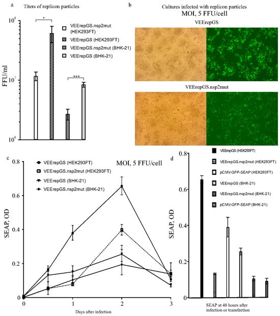 To create replicons, the gene-encoding structural proteins were removed from the TC-83 genome and the gene cassette GFP-2A-SEAP was cloned in their place under the control of the subgenomic promoter. Two replicons were created, VEErepGS and VEErepGS.nsP2mut (Figure 1b,c), which differ in only one nucleotide position 3865 (wild type adenine in VEErepGS; or mutant thymidine in VEErepGS.nsP2mut). This change leads to Gln to Leu substitution in nsP2 at a.a. position 739. The mutation Q739L enables VEEV replicons to replicate persistently in cells that produce type I interferons (IFN-I, including alpha- and beta-IFN) in response to viral infection and establish unresponsiveness to viral infection (antiviral state) []. One cell line used in this work (HEK293FT) is IFN-competent (produces IFN-I and responds to IFN-I). The other line BHK-21 cannot produce IFN-I. The mutant replicon was created to test if the capacity to establish persistent infection (in IFN-competent cells) is advantageous to obtain higher expression levels.