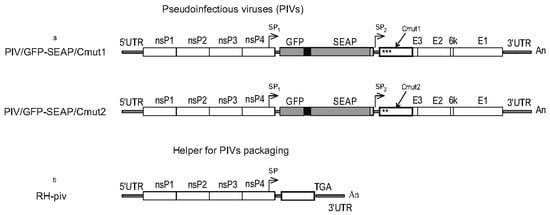 Overview of pseudoinfectious viruses and the replicable packaging helper. (a) A PIV is based on the VEEV genome. The capsid protein in PIV is a mutant incapable of encapsidating genomic RNA. Clusters of mutations in the N-terminal part of the capsid protein, specifically Cmut1 and Cmut2, are denoted with stars *** and **, respectively. A second copy of subgenomic promoter (SP) is present in the PIV genome. Gene cassette GFP-2A-SEAP is cloned under the control of SP1 and structural protein genes (including mutant C) are under the control of SP2. The two PIVs are different depending on the version of the mutant capsid protein. (b) Replicable helper RH-piv has complete genes for replicase nsP1-nsP4 as well as cis-acting sequences 5′UTR and 3′UTR. Only the capsid protein gene (wild-type) is present in the helper in the structural genes region. Symbols are the same as in Figure 1.