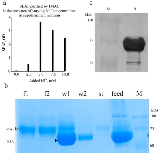 Finding optimal nickel ion concentration and SEAP purification. (a) Finding optimal concentration of Ni2+ to add to supplemented chromatographic feed to prevent Ni2+ leaching from IMAC resin. Activity of SEAP in eluates is shown. (b) SDS-PAGE with samples collected during SEAP purification from culture medium. F1,f2, fractions eluted in 250 mM imidazole. W1,w2, material washed from IMAC resin (two successive washes) with 50 mM imidazole. St, material collected upon stripping resin with 50 mM EDTA. Feed, conditioned medium. M, molecular mass marker. Bands of SEAP and BSA labeled with right-pointing triangles. (c) Western blot with anti-His-tag antibody. F1, sample from panel (a). Bands of molecular mass marker (M) remain visible on the membrane.