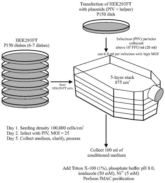 Large-scale producing cultures were in five-layer stacks Multilayer Cell Culture Flasks (VWR, Radnor, PA, USA, Cat, 734-3418). HEK293T cells were grown in 6-7 P150 dishes to obtain seeding amounts of the cells. The cells were trypsinized and transferred into a five-layer stack with seeding density 100,000 cells/cm2. In some experiments, a fixed number of 180 million cells were seeded into the stack on the day of infection. To infect the cells, PIV particles were diluted in 50 mL of DPBS + 1% FBS. A range of MOIs were used in different experiments. The medium was removed from the stack, and the infectious inoculum was poured in and distributed over the shelves. The stack was incubated for 1 h with occasional shaking. Then, the DPBS was removed, and 100 mL of complete medium added. The conditioned medium was collected at 48 h post-infection (hpi). The collected medium was clarified by centrifugation (6000 rpm 10 min) and stored before processing at −80 °C.