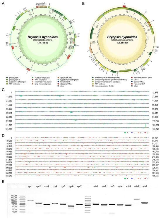 Information of organellar genomes’ assembly and annotation of Bryopsis hypnoides. (A,B) Circular genome map of the chloroplast (A) and mitochondrial (B) genomes of B. hypnoides. The genomic characteristics transcribed in the clockwise and counterclockwise directions are depicted on the inner and outer regions of the circular map, respectively. The functional classification of genes in the organellar genomes is visually represented using color-coding. The GC content is visually represented in the inner circle using a dark green (or yellow) plot. The GC content of each gene is indicated within the gene by dark areas. (C,D) Results of sequencing reads mapped to the assembled chloroplast (C) and mitochondrial (D) genomes. Different colors represent different bases. (E) PCR results for 14 loci on the organellar genomes. Columns 1 and 9 are markers. Original images can be found in Figure S1C.
