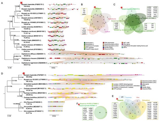 Phylogenetic analysis in order Bryopsidales. (A,D) Phylogenetic tree based on 50 or 7 homologous protein-coding genes in 14 or 9 plants’ chloroplasts (A) and mitochondrial (D) using maximum likelihood (ML) analysis. Numbers in the nodes are support values of Neighbor-Joining, Mrbayes test, and the ML bootstrap from 1000 replicates. Collinearity of protein-coding sequences between organellar genomes of B. hypnoides and other species showed on the left of the tree, and conserved blocks are visualized in gray (forward) or orange (inversions). The red star represents B. hypnoides. (B,E) The distribution of the genus-level common genes between different genera. Genes in boxes are genus-level common genes of each genus. The red star represents genus Bryopsis. (C,F) The distribution of the species-level common genes in order Bryopsidales. Genes in boxes are species-level common genes of each species. The red star represents B. hypnoides.