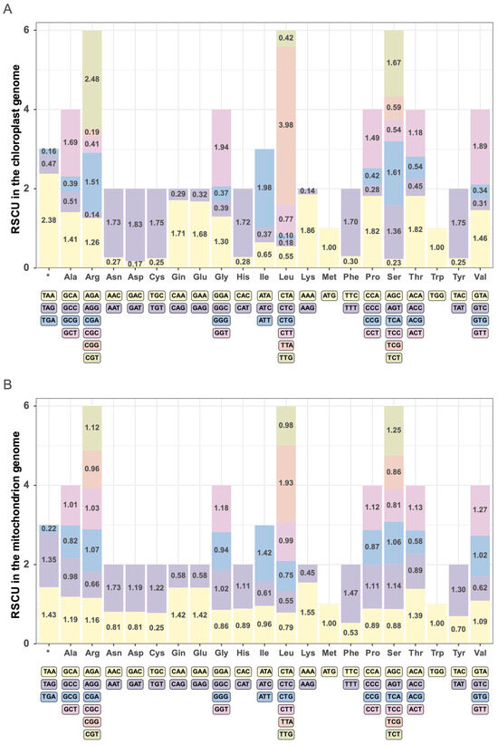 Relative Synonymous Codon Usage (RSCU) analysis in B. hypnoides chloroplast (A) and mitochondrial (B) genomes. The abscission represents the different amino acids, the corresponding codon of each amino acid (distinguished by different colors) is shown below the abscission, and the ordinate is the RSCU value.