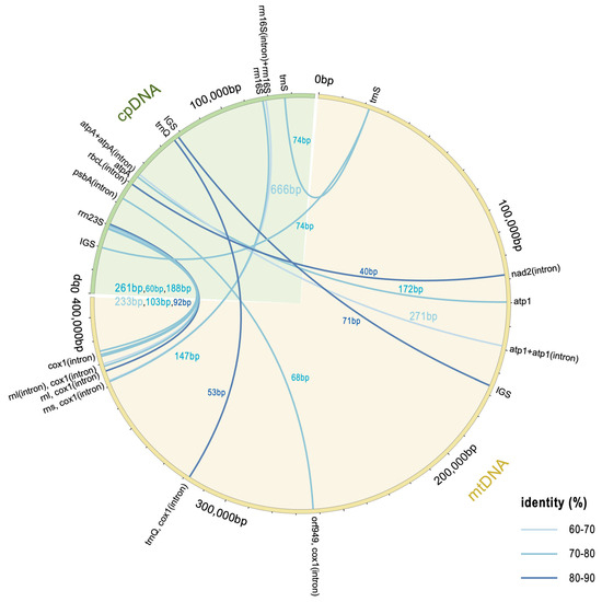 To identify DNA fragment transfers between chloroplast and mitochondrial genomes, BLASTN (E ≤ 1 × 10−5) was used to perform sequence similarity analyses. Homologous regions with high similarity were identified and visualized to elucidate gene transfer events.