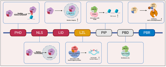 ING proteins are multi-domain, highly conserved proteins that exhibit significant homology across their family members [15]. While the N-terminal domains of each family member are distinct, they share similar overall structural features. All ING proteins contain three conserved regions: the lamin-interacting domain (LID), the nuclear localization signal (NLS), and the plant homeodomain (PHD) motif (Figure 1). The NLS domain directs ING proteins to the nucleus by binding to nucleolar proteins, thereby facilitating their functional roles within the nuclear compartment. For example, under stress conditions, targeting ING1 to the nucleus promotes apoptosis [16]. The highly conserved PHD motif, consisting of 50 amino acids, activates gene transcription by binding to the histone markers H3K4me3 and H3K4me2 [17,18]. The LID is essential for interacting with lamin A and could maintain nuclear morphology, at least in the case of ING1 [19]. This interaction is important for the structural integrity of the nucleus. In addition to these common features, ING proteins, with the exception of ING1, contain a unique leucine zipper-like (LZL) motif. This motif facilitates interactions with proteins that possess leucine zippers, such as the oncoproteins Jun, Fos, and Myc, which are functionally involved in the regulation of oncogene expression [20]. Furthermore, it is essential for ING2-mediated nucleotide excision repair and apoptosis [21].