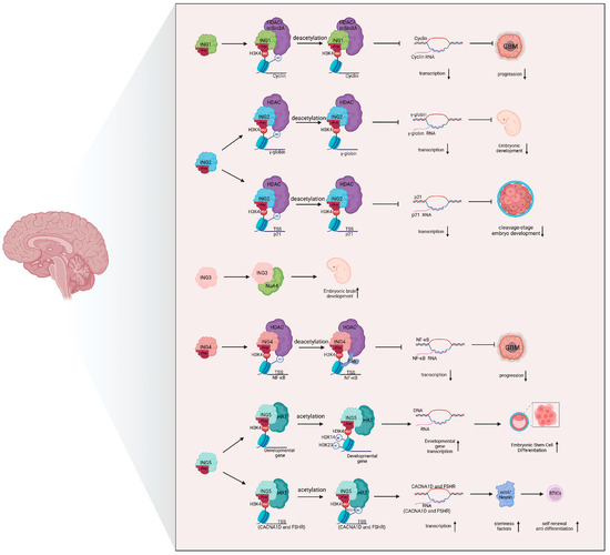 Similarly, studies have shown that ING2 promotes alternations in gene expression by binding to H3K4me3 and modulating chromatin modifications, which is crucial for early embryonic development. The downregulation of ING2 during mouse embryonic development results in developmental arrest, underscoring its critical role in regulating development. This occurs through ING2’s recruitment of HDAC to the P21 promoter region, promoting acetylation and enhancing P21 transcription (Figure 2) [57]. In human fetal development, ING2 also suppresses the transcription of the γ-globin gene by recognizing H3K4me3 and recruiting the HDAC complex, which reduces acetylation at this site [58]. Moreover, ING5 participates in acetyltransferase complexes such as MOZ/MORF and HBO1, co-regulating embryonic stem cell self-renewal and differentiation in conjunction with H3K4 methylation catalyzed by Set1A [59].