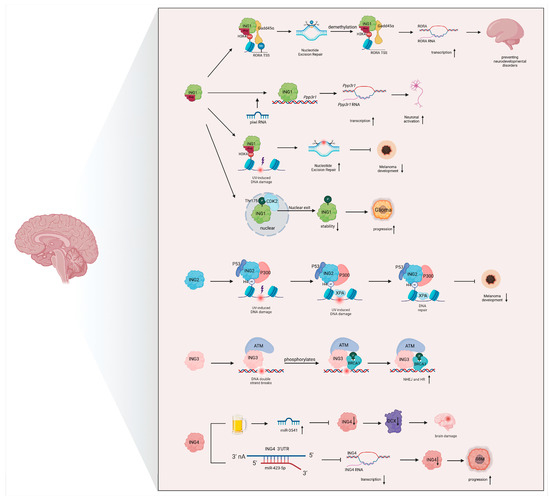 ING proteins are crucial for maintaining genomic integrity in neurobiology, where they influence both DNA modification and DNA damage repair [4,10]. By coordinating processes such as DNA methylation and DNA repair pathways, ING proteins help regulate gene expression and protect neurons—highly specialized cells that are particularly susceptible to genomic insults [60,61].