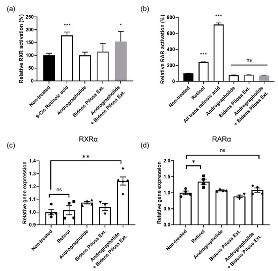Effects of andrographolide and Bidens pilosa extract (BPE) on receptor activity and gene expression. (a) RXR alpha was activated by co-treatment of andrographolide and BPE. 9-cis retinoic acid was used as positive control (n = 6 per group). (b) RAR gamma was activated by retinol and all-trans retinoic acid. Andrographolide and BPE did not affect RAR gamma activity (n = 6 per group). (c) Expression of RXRA gene was enhanced by andrographolide and BPE (n = 3–6). (d) Expression of RARA gene was not affected by andrographolide and BPE (n = 3–4). Error bars represent standard error of the mean. ns: not significant, * p < 0.05, ** p < 0.01, *** p < 0.001; one-way ANOVA analysis and Kruskal–Wallis test for nonparametric statistics.