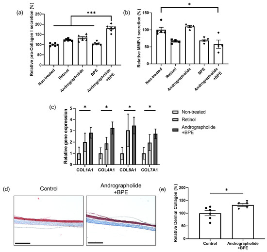 Effect of andrographolide and BPE on collagen synthesis in skin cells. (a) Protein level of pro-collagen type 1 alpha 1 secreted by skin cells (Hs68) was enhanced by combined treatment of andrographolide and BPE (n = 6 per group). (b) Protein level of MMP-1 secreted by skin cells (Hs68) was reduced by combined treatment of andrographolide and BPE (n = 4–5). (c) Gene expressions of different types of collagens were enhanced by co-treatment of andrographolide and BPE (n = 6 per group). (d) Representative images of artificial 3D skin. Scale bar = 275 μm. The blue color represents collagen. (e) Relative collagen content in dermal area of artificial 3D skin. Collagen content was enhanced by combined treatment of andrographolide and BPE (n = 5–6) Error bars represent standard error of the mean. * p < 0.05, *** p < 0.001; one-way ANOVA analysis, Student’s t-test and Kruskal–Wallis test for nonparametric statistics.