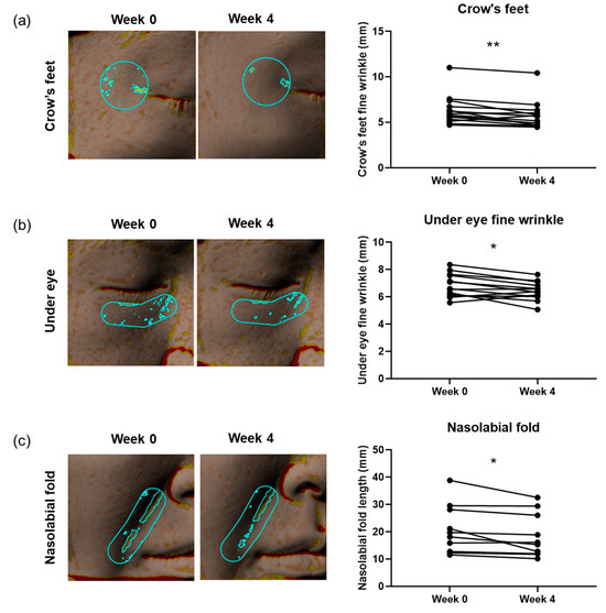 Wrinkle improvement by a cream containing andrographolide and BPE (RXR formula). (a) Fine wrinkle in crow’s feet was improved by RXR formula (n = 14). Left: representative images of crow’s feet captured using Antera 3D at weeks 0 and 4 after treatment. The highlighted area within the selected region represents fine wrinkles. Right: Change in crow’s feet fine wrinkle. (b) Fine wrinkle in under-eye area was improved by the RXR formula (n = 13). Left: representative images of under-eye area captured using Antera 3D at weeks 0 and 4 after treatment. The highlighted area within the selected region represents fine wrinkles. Right: Change in fine wrinkle of under eye. (c) Nasolabial fold length was reduced by the RXR formula (n = 10). Left: representative images of nasolabial fold captured using Antera 3D at weeks 0 and 4 after treatment. The highlighted area within the selected region represents nasolabial fold. Right: change in nasolabial fold length. * p < 0.05, ** p < 0.01; paired t-test.