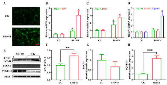 The impact of RORA activation on autophagy markers in HFSCs. * p < 0.05, ** 0.001 < p < 0.01, *** 0.0001 < p < 0.001. (A) Detection of cellular autophagy levels between the control group (CG) and the experimental group (treated with SR1078) using MDC staining. Scale bar, 25 μm. (B) Relative mRNA expression levels of Atg2a and Atg2b genes. (C) Relative mRNA expression levels of Atg12 and Atg13 genes. (D) Relative mRNA expression levels of Atg101, Beclin 1, and Sqstm1 genes. (E) The WB detection of autophagy marker protein level changes between the control group and the experimental group (treated with SR1078) (n = 3). (F) Comparison of LC3-II/LC3-I levels between the control group (CG) and the experimental group (treated with SR1078). (G) Comparison of BECN1 levels between the control group (CG) and the experimental group (treated with SR1078). (H) Comparison of SQSTM1 levels between the control group (CG) and the experimental group (treated with SR1078). Original images can be found in Figure S1.