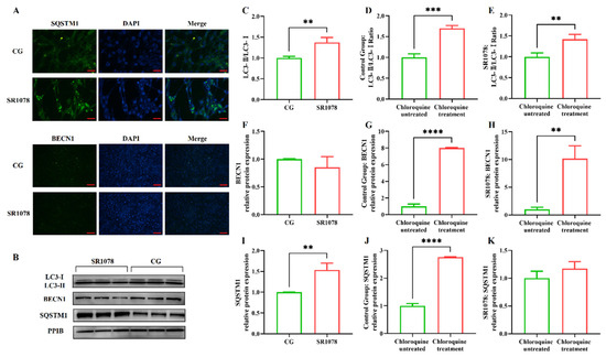 The premise of using the LC3 II/LC3 I ratio to assess cellular autophagy levels is the unobstructed autophagic flux, especially when multiple test results consistently indicate a significant increase in the level of the Sqstm1 gene, suggesting an impairment in autophagic flux. Therefore, we treated the cells with chloroquine to block the fusion of autophagosomes with lysosomes, allowing us to detect whether autophagic flux is normal. The results showed that the LC3 II/LC3 I ratio underwent significant changes before and after chloroquine treatment, with an increase observed in both the experimental and control groups, indicating that autophagic flux was unobstructed in both groups (Figure 2C–E). Compared to the control group, treatment with SR1078 had an impact on BECN1 protein levels, but the difference was not significant. However, after chloroquine treatment, BECN1 protein levels in both the experimental and control groups increased significantly compared to pre-treatment levels, suggesting that chloroquine-induced blockade of autophagic flux led to the accumulation of BECN1 protein. This indicates that autophagic flux was unobstructed before chloroquine treatment, while SR1078 had no significant effect on BECN1 protein levels. These findings are consistent with the LC3 II/LC3 I ratio results (Figure 2F–H). Additionally, SQSTM1 protein levels also changed before and after chloroquine treatment. Following autophagy blockade, SQSTM1 protein levels in the control group increased significantly, indicating that chloroquine treatment disrupted autophagic flux in the control group, leading to impaired SQSTM1 degradation and accumulation. In the experimental group treated with SR1078, SQSTM1 levels also increased significantly before and after chloroquine treatment, confirming that autophagic flux was not blocked by the experimental treatment (Figure 2I–K).