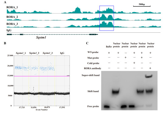 Verification of the interaction between RORA and the Sqstm1 gene. (A) CUT&Tag enrichment signal in the promoter region of the Sqstm1 gene [42]. (B) Detection results of ddPCR for fragments of the Sqstm1 gene promoter region in CUT&RUN enrichment products. (C) The EMSA detection results for the interaction between RORA and Sqstm1. Original images can be found in Figure S3.