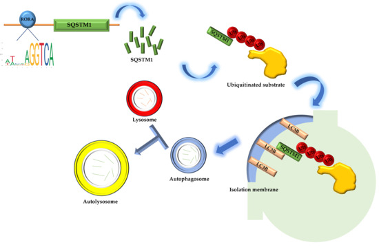 The Sqstm1 gene plays a crucial role in various biological processes due to its complex domain structure. The SQSTM1 protein mediates phase separation through the polymerization of its N-terminal PB1 domain and the binding of its C-terminal UBA domain to ubiquitin [50]. In addition, the PB1 domain at the N-terminus of SQSTM1 may interact with Rpt1 and S5a/Rpn10 of the 26S proteasome, while the C-terminal UBA domain binds ubiquitinated proteins, facilitating the degradation of short-lived, misfolded, and damaged proteins through the ubiquitin–proteasome system. The SQSTM1 protein also undergoes continuous and rapid nucleocytoplasmic shuttling via its two nuclear localization signals (NLS1 and NLS2) and a nuclear export sequence (NES), enabling the transport of ubiquitinated cargo between the nucleus and cytoplasm [51,52]. In terms of oxidative stress regulation, the SQSTM1 protein modulates cellular oxidative stress by influencing the NRF2-KEAP1 signaling pathway [53,54,55,56]. Most importantly, the SQSTM1 protein is highly involved in selective autophagy [57]. The SQSTM1 protein binds to ubiquitin oligomeric chains of ubiquitinated substrates through its C-terminal UBA domain, while the PB1 domain assists in the packaging of ubiquitinated substrates through self-oligomerization. The LIR domain binds to the LC3B protein located on the isolation membrane, the precursor of autophagosomes, aiding the entry of ubiquitinated substrates into autophagosomes. Autophagosomes then fuse with lysosomes to form autolysosomes, ultimately completing the degradation of substrates [58]. Our research results indicate that activated RORA binds to the promoter region of the Sqstm1 gene to regulate its transcription level. The upregulation of SQSTM1 protein expression suggests enhanced interactions between SQSTM1 adapter proteins, ubiquitinated substrates, and LC3B protein on the isolation membrane, thereby increasing the efficiency of ubiquitinated substrate entry into autophagosomes and ultimately upregulating the level of selective autophagy (Figure 4). The association between RORA and cellular autophagy has been demonstrated in related studies. During myocardial ischemia/reperfusion injury, cellular autophagy levels are significantly inhibited, and the absence of RORA significantly exacerbates this autophagy inhibition, suggesting that endogenous RORA may help restore autophagy function after myocardial ischemia/reperfusion injury [59]. Research in cancer also shows that RORA significantly promotes autophagy levels in cancer cells [60]. These findings corroborate the conclusion of our study that RORA promotes autophagy levels in HFSCs, but in previous studies focusing on the relationship between RORA and autophagy, the level of SQSTM1 protein was often considered to negatively correlate with the level of autophagy. However, our research has revealed that Sqstm1 is a direct downstream target gene of RORA. Activation of RORA results in a significant upregulation of SQSTM1 levels in the hair follicle stem cells of rats. Meanwhile, changes in the LC3 II/LC3 I ratio and results from MDC staining all suggest an increase in autophagy levels. Therefore, we propose that RORA affects the autophagy level of HFSCs by upregulating selective autophagy.